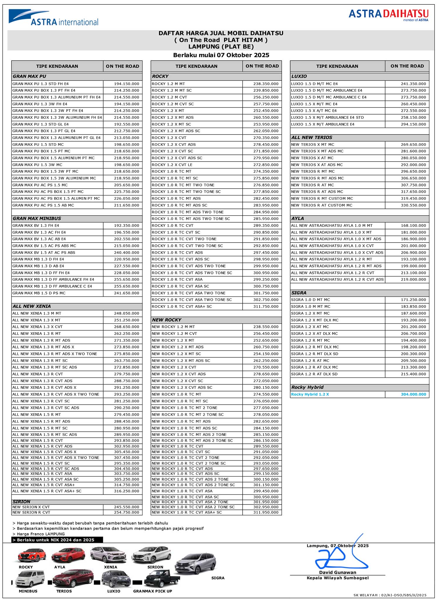 Di ujung setiap perjalanan, selalu ada tempat untuk kembali—dan di tanah Lampung yang hangat ini, Daihatsu hadir sebagai bagian dari cerita hidup Anda. Dari garis pantai yang menyapa matahari pagi, hingga jalan-jalan panjang yang membelah kebun, perbukitan, dan kota, setiap roda yang berputar menyimpan harapan, kerja keras, dan mimpi yang terus tumbuh. Melalui kendaraan yang tangguh, nyaman, dan setia, kami percaya perjalanan bukan sekadar berpindah tempat, melainkan tentang menemani setiap langkah kehidupan: mengantar anak ke sekolah, membawa keluarga pulang kampung, hingga mengejar rezeki di pagi yang masih basah oleh embun. Bersama Sales Daihatsu Lampung, kami berkomitmen menjadi bagian dari kisah itu—memberikan pelayanan tulus, informasi jujur, dan pendampingan terbaik dari awal hingga akhir. Semoga setiap mobil yang Anda pilih bukan hanya menjadi kendaraan, tetapi juga sahabat setia di setiap lintasan hidup di bumi Lampung yang kaya akan cerita, harapan, dan masa depan.