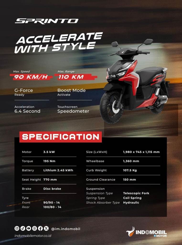 Sprinto adalah denyut cepat kota Padang yang terus bergerak. Ia lincah, responsif, dan penuh energi—cocok bagi mereka yang hidup dalam ritme cepat antara kerja, pertemuan, dan aktivitas harian. Di tengah hiruk pikuk kota, Sprinto melaju tanpa suara bising, menghadirkan pengalaman berkendara yang modern dan dinamis. Teknologi cerdas yang dibawanya seolah menyatu dengan gaya hidup generasi baru Padang: praktis, terkoneksi, dan selalu siap melangkah ke depan.