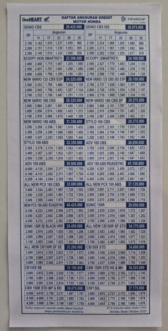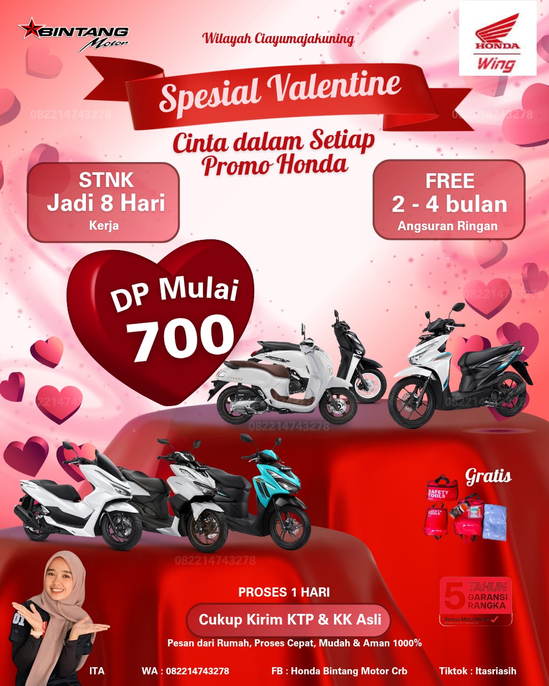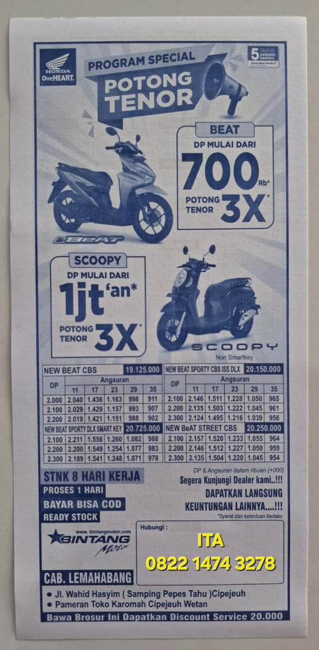 - Tanyakan Jika Anda Ingin Membeli Motor Honda Secara Kredit Tentang Leasing Rekanan Motor Honda Terbaik, Info Simulasi Dan Konsultasi Kredit, Sesuaikan TDP Dan Angsuran Sesuai Dengan kemampuan Anda Atau Pilih Paket Kredit Murah Dan Angsuran Ringan Yang Sesuai Dengan Penghasilan Anda, Dapatkan Juga Info Tentang Tingkat Suku Bunga, Tenor Atau Jangka Waktu Kredit Anda.