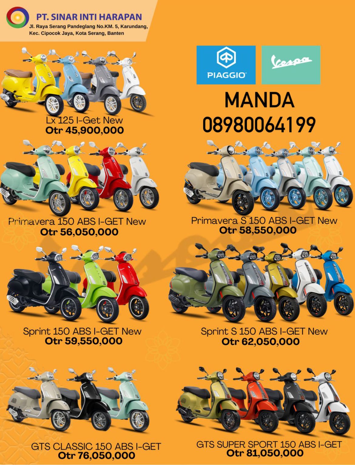 Kontak Sales Marketing Di Dealer Motor Vespa Serang Untuk Informasi Alamat Showroom, Harga Terbaru, Promo, Paket Kredit, Diskon, Cashback, Simulasi Kredit Dan Test Drive Motor Vespa. Produk Vespa Terdiri Dari Motor Vespa LX, Primavera, Sprint, GTS, GTS Super Tech, GTV, Batik, Elettrica. Tersedia Promo DP Kredit Murah dan Cicilan Ringan, Proses Cepat Atau Disesuaikan Dengan Kemampuan Anda. Hubungi Sales Marketing Kami Segera Untuk Mendapatkan Pelayanan Terbaik dan Kunjungi Alamat Showroom (Dealer) Kami Atau Jika Anda Sibuk Kami Bersedia Berkunjung Ke / Di Tempat Anda. Menerima Tukar Tambah Motor Seken / Bekas, Motor Bekas Anda Juga Bisa Dijadiin DP / Uang Muka Motor Baru (New) Vespa. Jika Motor Anda Mengalami Kerusakan Atau Ingin Service Silahkan Bawa Ke Bengkel Resmi Kami. Dapatkan Info Promo Terbaru Vespa Serang Setiap Bulan Januari Febuari Maret April Mei Juni Juli Agustus September Oktober November Desember Setiap Tahun 2024 2025 2026.